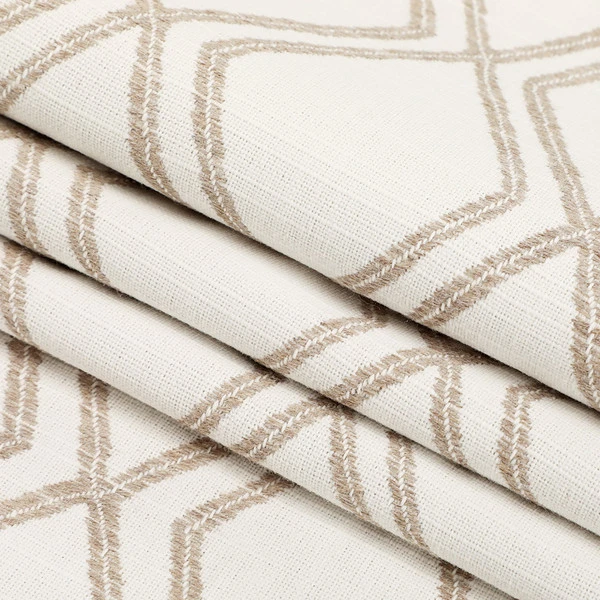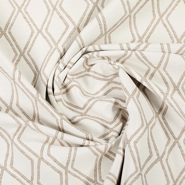 Sunbrella® Voyage Dune is a 100% acrylic performance fabric. It features a geometric pattern of stone-outlined diamonds on a white background that brings subtle sophistication to whatever project it’s used for.