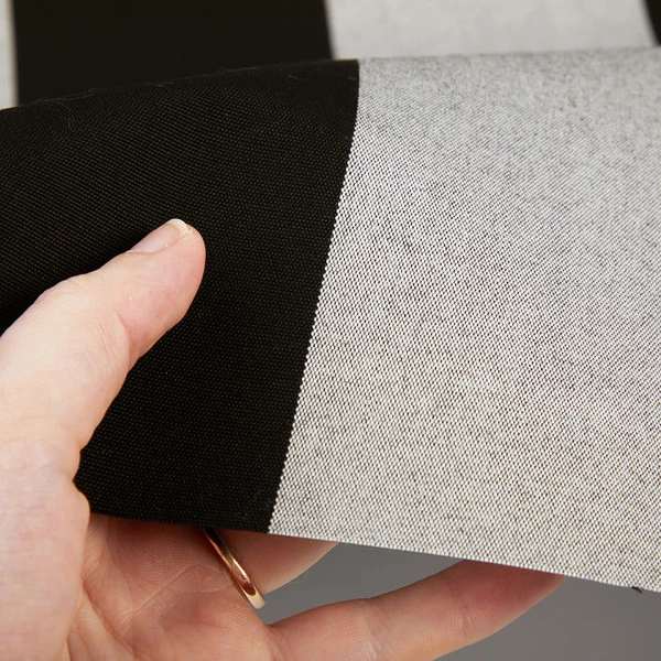 Note: The light stripe of this awning fabric is comprised of black and white threads woven together, making it grey in appearance.
